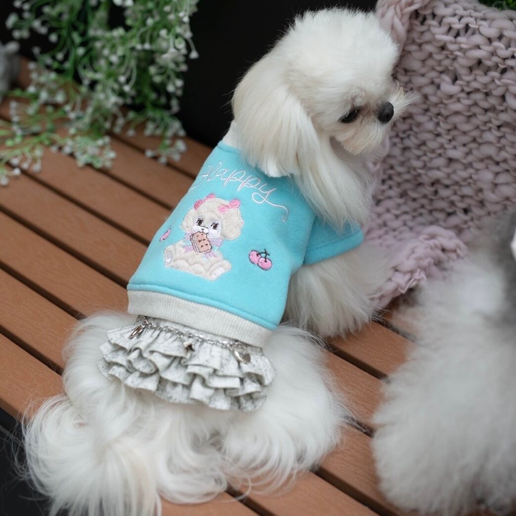 柔らかく質感のある高級なプラッシュ アップリケ刺繍と、愛らしいフレアスリーブが